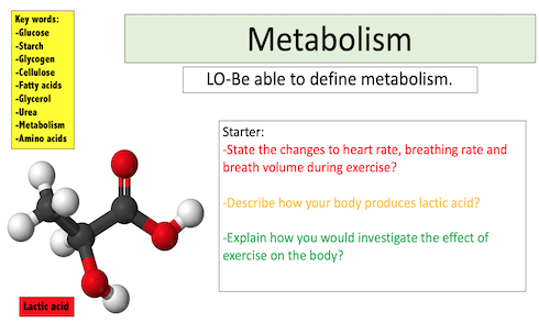 Designed for the new specification AQA GCSE( covers spec point 4.4.2.3) course but can be modified for other exam boards. 11 slides covering Metabolism. By the end of the powerpoint students would have covered: -Define metabolism -Give examples of metabolic reactions