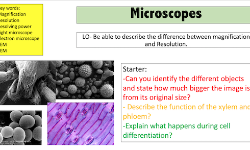Designed for the new specification AQA GCSE(cover spec point 4.1.1) course but can be modified for other exam boards. 24 slides covering the topic of microscopes. By the end of the powerpoint students would have covered: -Understand that microscopy has developed over time -State the difference between electron and light microscopes -Be able to calculate the magnification, real size and image size of a specimen Includes details of a practical looking at Banana cells which is optional.